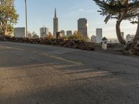 This is an image overlooking a suburban road in California, USA at dawn. The asphalt road curves through the landscape, providing a beautiful view of the city skyline of San Francisco in the distance. The clear sky above adds to the serene atmosphere of the scene. This photo represents a recreational viewpoint where visitors can enjoy an overview of the cityscape. Get a glimpse of the beauty and charm of San Francisco with this stunning image.