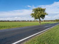 A scenic landscape in rural Germany. Lush green fields stretch out as far as the eye can see under a clear sky. A winding road traverses the countryside, surrounded by vibrant vegetation