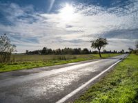 This is an image of a rural road in Berlin, Germany. The clear blue sky and lush green vegetation create a picturesque landscape. The road surface, made of asphalt, contrasts with the surrounding grass and fields. This photo captures the essence of autumn in Europe, with vibrant colors and a tranquil atmosphere. It showcases the beauty of nature and the peacefulness of the countryside. Whether you are interested in agriculture or simply enjoy being surrounded by nature, this image will transport you to the idyllic landscapes of Germany.