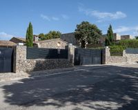 This is an image of a residential area in Mallorca, Spain. The picture shows a clear sky above a road made of asphalt. The houses and buildings in the residential area can be seen lining the road. This scene represents a typical day in Mallorca, located in the Balearic Islands of Spain. The image reflects the charm and beauty of this European island destination.