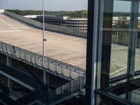 A clear sky day in the Netherlands, showcasing modern architecture in a bustling city. High-rise buildings with concrete facades stand tall, while a road and open spaces provide easy access. A parking lot and deck cater to the metropolitan area.