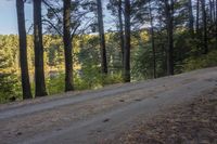 This is an image of a clear blue sky reflecting on the calm waters of a lake in Ontario, Canada. The tranquil landscape showcases a dense forest and towering mountains in the background. A winding road surface, lined with trees and vegetation, leads towards the water. The sunlight casts hard shadows on the asphalt and dirt road, creating a dramatic effect. The scene is serene and peaceful, capturing the beauty of nature in Ontario. This photo represents a typical day in the Canadian landscape.