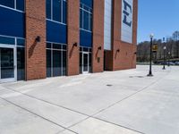This is an image of a concrete surface in a stadium. The clear sky provides a backdrop for the large brick building and the blue and white sign that reads 'E & B'. The image represents a day at the stadium and captures the atmosphere of a football match. The concrete surface reflects the excitement and energy of the sport. This photo showcases the combination of architecture and sports in a unique setting.