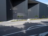 This image captures a modern architectural design in Europe, specifically in Germany. The black building with arrows on it stands out against the clear sky. In the foreground, a tree and bushes provide a touch of vegetation. The asphalted street, with its well-defined rectangle shape, adds to the urban design. This photo represents the combination of modern architecture and nature in a European setting.
