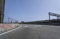 This image captures a straight and long highway, lined with graffiti and road markers. The asphalt road surface shows a slight motion blur, indicating the speed of passing vehicles. In the background, a pedestrian bridge crosses over the highway, adding an urban element to the scenery. The clear sky above complements the parallel lines of the highway and the iron guard rails. This photo represents a typical day on an urban thoroughfare, showcasing the infrastructure and public space. The graffiti adds a touch of character to this bustling scene.
