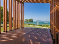 This image captures the beautiful coastal architecture of Hong Kong against a clear sky. The open space features a wood floor with hard shadows, adding depth and texture to the scene. The coastline is visible in the background, with the ocean's sparkling water reflecting the sunlight. This photo represents a typical day in Hong Kong, showcasing the unique blend of modern architecture and natural coastal beauty that the city has to offer.