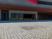 a woman riding a skateboard on top of a brick road next to a restaurant