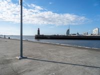 A view of the Bremerhafen harbor in Germany. The concrete streets and buildings blend with the coastal landscape. Street lights line the road, leading to an open space filled with urban design elements. The clear sky and horizon complete the city scene.