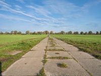 This image shows a straight road in a rural area of Berlin, Germany. The pathway is surrounded by lush green vegetation and grass. The clear blue sky above adds to the serene landscape. This photo captures the beauty of nature in autumn, with vibrant foliage and a peaceful atmosphere. The concrete street is free from any cars, creating a calm and quiet environment. This scene represents the tranquility of rural life in Europe.