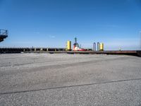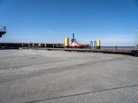 This image captures the vibrant industrial scene of the Bremerhafen container port in Bremen, Germany. The clear sky above highlights the horizon and coastline, reflecting the peacefulness of the ocean waters. In the foreground, a man in a black shirt stands on the cement dock, observing the red equipment. The pier and jetty provide access to the open space for boats to land. This photo showcases the thriving industrial and coastal landscapes of Europe, specifically in Germany.