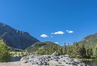 This is an image of a scenic mountain road winding through the highlands. The road is surrounded by breathtaking natural beauty, with towering trees, rugged cliffs, and a clear sky above. In the distance, a serene lake reflects the stunning mountain range and rock walls. The open space and wilderness create a peaceful and tranquil atmosphere. This photo captures the essence of nature's untouched beauty and would be a perfect addition to any outdoor or travel-related project.