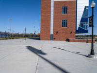 A clear sky casts a bright light on a concrete surface. The open space is transformed into a sport stadium. The walkway leads to the water, creating a picturesque scene on a sunny day.