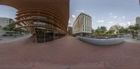 the view of some buildings from a fish - eye lens lens shows the outside area
