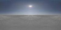A sunny day in an open space with a clear sky. The sun visible as it passes through the horizon, creating a beautiful dawn. The sandy surface adds to the natural landscape.