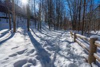 a bench sitting on top of snow covered ground next to trees and forest signs with sun reflecting off them