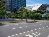 This image captures a scene from Taipei City, Taiwan. The modern architecture, futuristic design, and clear skies reflect the urban atmosphere of the city. The empty road leads through a tree-lined street and features a bus stop sign. The skyline of Taipei City can be seen in the distance. The photo represents city life in Asia, specifically in the Republic of China. It showcases the urban design and infrastructure of the vibrant city. This image is a testament to the blend of modern and traditional elements found in Taipei City.