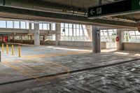 An empty parking garage in Toronto with open doors inviting people in. The urban design of the city is reflected in the concrete streets and buildings. A clear sky sets the backdrop for a typical day in the vibrant city of Toronto.