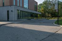 A residential neighborhood in Toronto, Canada, with well-maintained asphalt roads and driveways. The area is filled with suburban houses, office buildings, and a theater. Clear skies and shadows create a peaceful urban environment.