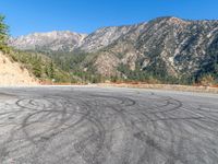 A tire painted on the road near the mountains creates an eye-catching image. The open space and clear sky add to the tranquil day. Gravel and dirt surface highlight the rugged mountain landscape.