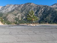This is an image of an open space with an empty parking lot in front of a mountain range. The clear sky serves as the backdrop for this scene. The dirt and gravel surface of the parking lot contrasts with the natural beauty of the mountains. This photo captures the peacefulness and serenity of a sunny day in this mountainous location.