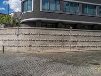 a cobblestone street next to two buildings with street signs on them, on a partly cloudy day