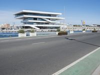 This is a photo of modern architecture in the city of Valencia, Spain. The image shows a clear sky and a view of the ocean. The cityscape features a road and a pier leading to the river. The modern buildings line the urban landscape, creating a unique and vibrant urban design. The infrastructure is well-developed, with a well-maintained road surface and a jetty for landing boats. With its beautiful harbor and Europe's influence, Valencia is a city that blends history and modernity seamlessly. This photo captures the essence of Valencia's architecture and urban charm.