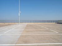 a empty parking lot with an antenna on top and blue sky above it, next to some metal fences