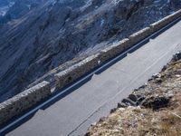 A thrilling motorcycle ride along a winding road on a cliff, overlooking snow-capped mountains in South Tyrol, Italy. The landscape offers a breathtaking view of the Stelvio Pass, with its high mountain range and glacial Moraine. A top-down perspective captures the essence of this exhilarating journey.