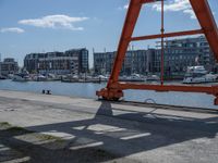 This image captures the modern architecture and urban design of Bremerhafen, Germany. The vibrant red crane stands tall in front of the buildings on the river bank, while boats and a pier can be seen in the background. The clear sky provides a beautiful backdrop to the cityscape. This photo represents the city life and harbor activities of Bremerhafen. The concrete streets and buildings reflect the urban environment, while the jetty and boats showcase the residential and recreational aspects of the city.