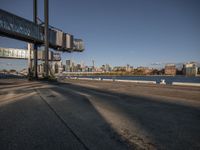 A coastal city with modern architecture and a harbor. Clear skies and hard shadows create a striking contrast against the open spaces and the ocean. Street lights illuminate the roads and loading docks.