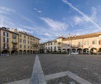 A view of a modern cityscape with cloudy skies. Tall buildings with windows line the road surface. The urban design features unique flooring and landmark facades.