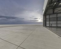 the sky is very cloudy and a concrete path runs through it near the airport building