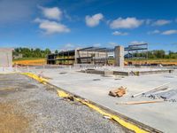 This image captures a construction area with buildings on a cloudy day. The concrete surfaces and dirt areas are visible, along with gravel and sand. The scene showcases the dynamic nature of construction projects and the different materials used. The cloudy blue sky in the background adds a sense of depth to the image. This photo represents the progress and development happening within the construction industry.
