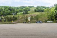 A scenic view of a rural road in Ontario, Canada. The road is surrounded by green grass and lush trees, with clear blue skies overhead. The open space provides ample parking and recreational opportunities. This is the perfect spot for outdoor activities like skiing and sports.