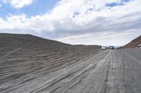 A straight road stretches through a scenic landscape. The asphalt surface glistens under a clear sky, leading to a rugged off-road track. The surrounding nature includes wood slopes and sand streets.