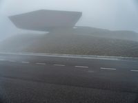 A gloomy day in Austria, with a grey sky and haze obscuring the landscape. The wet road and foggy atmosphere create a gloomy mood. The Timmelsjoch road winds through the grey slopes of Europe.