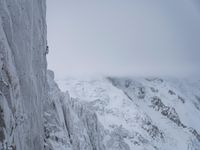 This image captures a gloomy winter day in the Alps, France. The photo shows a panoramic view of the mountainous landscape, with Mont Blanc and Aiguille du Midi in the distance. The grey sky and snow-covered surface add to the gloominess of the scene. The open space of the valley and the scarp face create a stunningly beautiful and serene nature view. This photo provides an overview of the magnificent landscape of the Alps, a popular destination for nature enthusiasts in Europe.