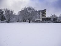 a person standing in the snow near tall buildings on a snowy day, with trees and buildings behind