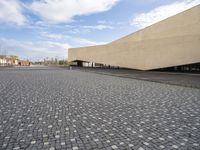 This image showcases an open courtyard in Lisbon, Portugal. The modern architecture of the building is highlighted by the large number of windows present. The surrounding buildings add to the urban design of the cityscape. The cobblestone road surface and open space create a unique atmosphere. The clear sky with clouds adds to the overall aesthetic of the scene. This photo captures the beauty of Lisbon's architecture and city landscape.
