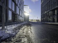 This image captures a sunny winter day in the city. The sunlight illuminates the road surface, creating a beautiful reflection. A modern glass building stands tall in the background, showcasing urban design. The clear sky with scattered clouds adds depth to the scene. This photo represents the intersection of nature and architecture in an urban setting. The high-rise building and the road surface symbolize human progress and infrastructure. The image captures the serene beauty of a city in winter.
