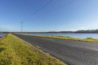 An asphalt road winds along the coastal landscape, with a small lake on one side and power lines overhead. Grass and vegetation line the road, under a clear sky and sunlight.