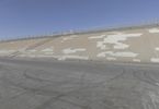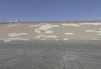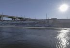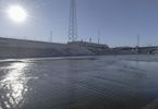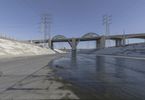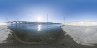 A fisheye lens captures a boat sitting in shallow water near power lines at an electricity facility. The coastal setting provides a picturesque backdrop, with the clear sky and winter sunshine reflecting off the water. A serene evening scene in California.