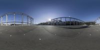a series of three shots showing a roller coaster and other rides in the background while it sun shines