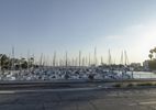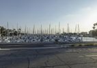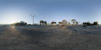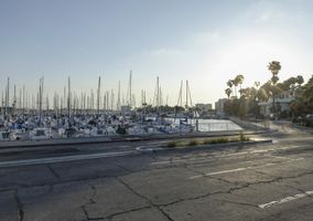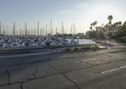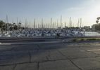 Coastal city intersection with parked car and parking spaces. Open space and vegetation surround the area. White building in the background overlooks the ocean. A map of the city's dome highlights nearby attractions.