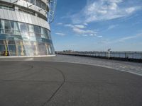 A clear sky day in Bremen, Germany. The coastal city showcases its modern architecture and urban design. The road surface lined with asphalt leads to the bustling harbor and waterfront hotels. An observation tower offers panoramic views of the city and the ocean.