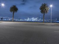palm trees next to the street with a bridge and night skyline in the background under cloudy skies