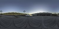A fisheye view of a pier next to a building overlooking a body of water. The coastal city comes alive with artificial light at night, creating a captivating urban scene.