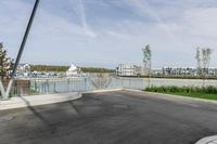 This is a photo taken in Toronto, Canada. The image shows a parking lot with a fence near the water. Several buildings are visible in the background, along with boats on the water. The cityscape reflects a vibrant urban design, with asphalt roads and curbs. The coastal location offers a beautiful view of the ocean and a nearby lake. The cloudy sky adds to the serene atmosphere. This photo represents a typical day in Toronto, showcasing the city's real estate and waterfront properties.
