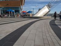 This is an image of an outdoor cityscape near the coast. The road surface is made of asphalt and is lined with buildings and cafes. Tables and umbrellas are set up outside, providing an area to eat out with a view of the ocean. In the distance, a sculpture can be seen on a high platform. The clear sky and coastal location create a picturesque scene. This photo captures the urban design and architecture of the city, offering a glimpse into the vibrant atmosphere of the waterfront area.