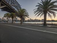 a view of an empty road with palm trees at the sides and bridge in the background
